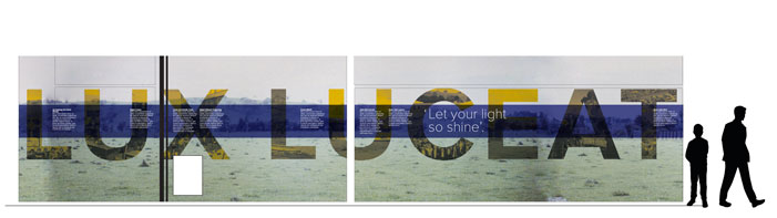 The background image links the current location to the state it was in at the time of the schools conception. The letters making up Lux Luceat are filled with key historical images while also acting as a visual representation of the schools motto. The smaller text on the purple bar further ad to the historical context and also a visual historical link to the patrons who make up the the School’s house system.