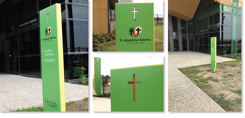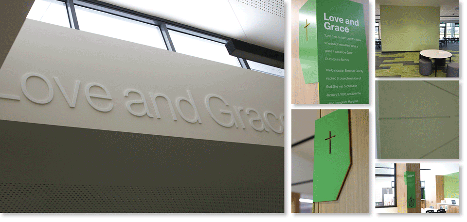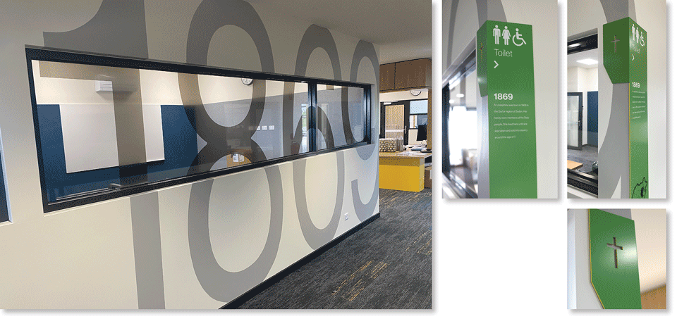 JWB&CO worked with DOSCEL [Diocese of Sale Catholic Education], St Josephine Bakhita Catholic Primary School Principal and Minx architects to create their new wayfinding and environmental graphics system. The system needed to fit the preset colour scheme of the architect to maintain overall visual consistency and coherence.