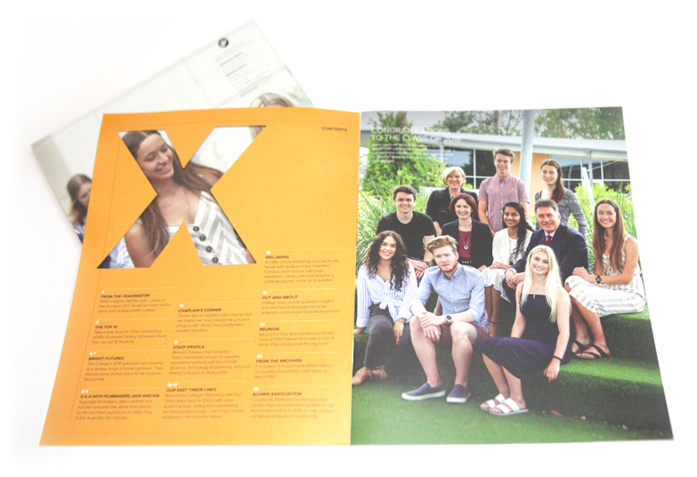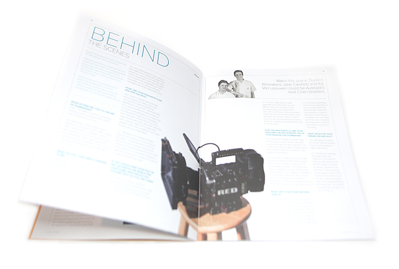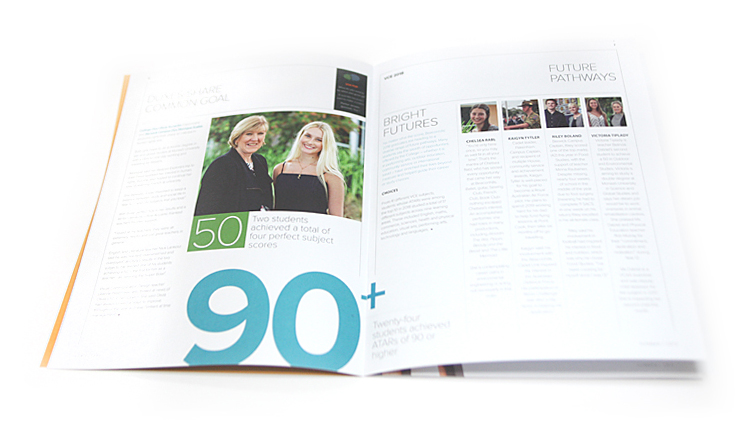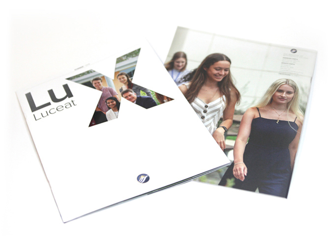 The school's position is around their motto, Lux Luceat, let your light shine. With this in mind we strove to utilise lots of white space... or light combined with a very flexible grid to allow for the various types of content. We too used a diecut on the front cover to reveal or allow the key hero image to shine through from the inside to the outside. Our printing Q/A also allowed for making sure the images did not dry back too dark on the uncoated stock as is typical. We managed this by many press checks and a great understanding witth the printer.